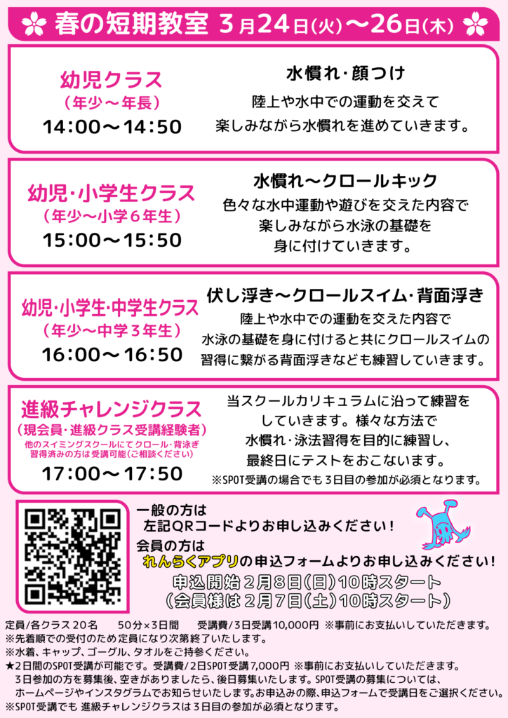 春の短期教室のご案内です。